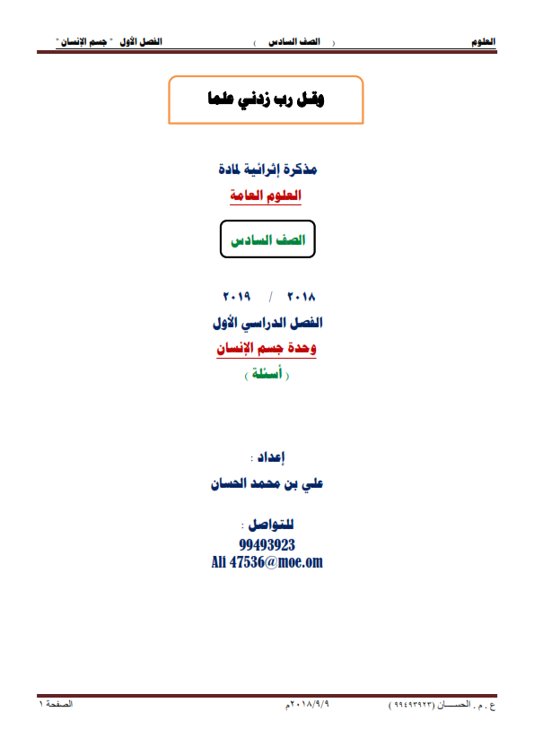 جسم الانسان في مادة العلوم للصف السادس الفصل الاول اسئلة واجوبة