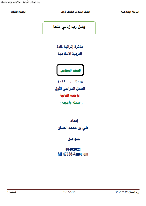 أوراق عمل الوحدة الثانية في مادة التربية الاسلامية للصف السادس اسئلة و اجوبة