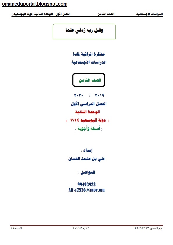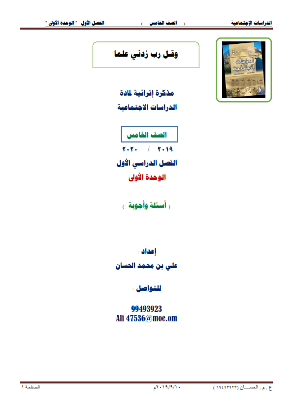 مذكرة اثرائية لمادة الدراسات الصف الخامس الوحدة الاولى ف الفصل اسئلة واجوبة