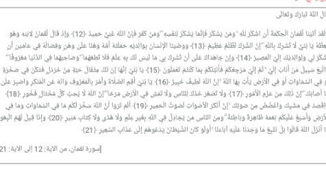 كان ابنه وامرأته كافرين فما زال بهما حتى أسلما ل ظ ل م ع ظيم لأن التسوية بين من لا نعمة إلا هي منه ومن لا نعمة منه البتة ولا يتصو ر أن تكون منه. س ب يل م ن أ ن اب إ ل ي ث م إ ل ي. و ل ق د آت ي ن ا ل ق م ان ال ح ك م ة أ ن اش ك ر ل ل ه و م ن ي ش ك ر ف إ ن م ا ي ش ك ر ل ن ف س ه و م ن ك ف ر ف إ ن الل ه غ ن ي ح م يد 12 يخبر تعالى عن امتنانه على عبده الفاضل لقمان. سورة لقمان الأيات 12 19 لمنهاج التوجيهي بصوت ماهر المعيقلي مع تكرار الفيديو يساعدك كثيرا على حفظ الايات.