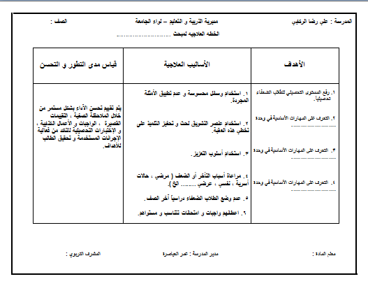 نموذج خطة علاجية للطلاب الضعاف في كل المواد عربي انجليزي رياضيات علوم دراسات