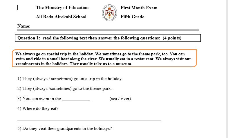 امتحان الشهر الاول في اللغة الانجليزية للصف الخامس الفصل الدراسي الاول 2018