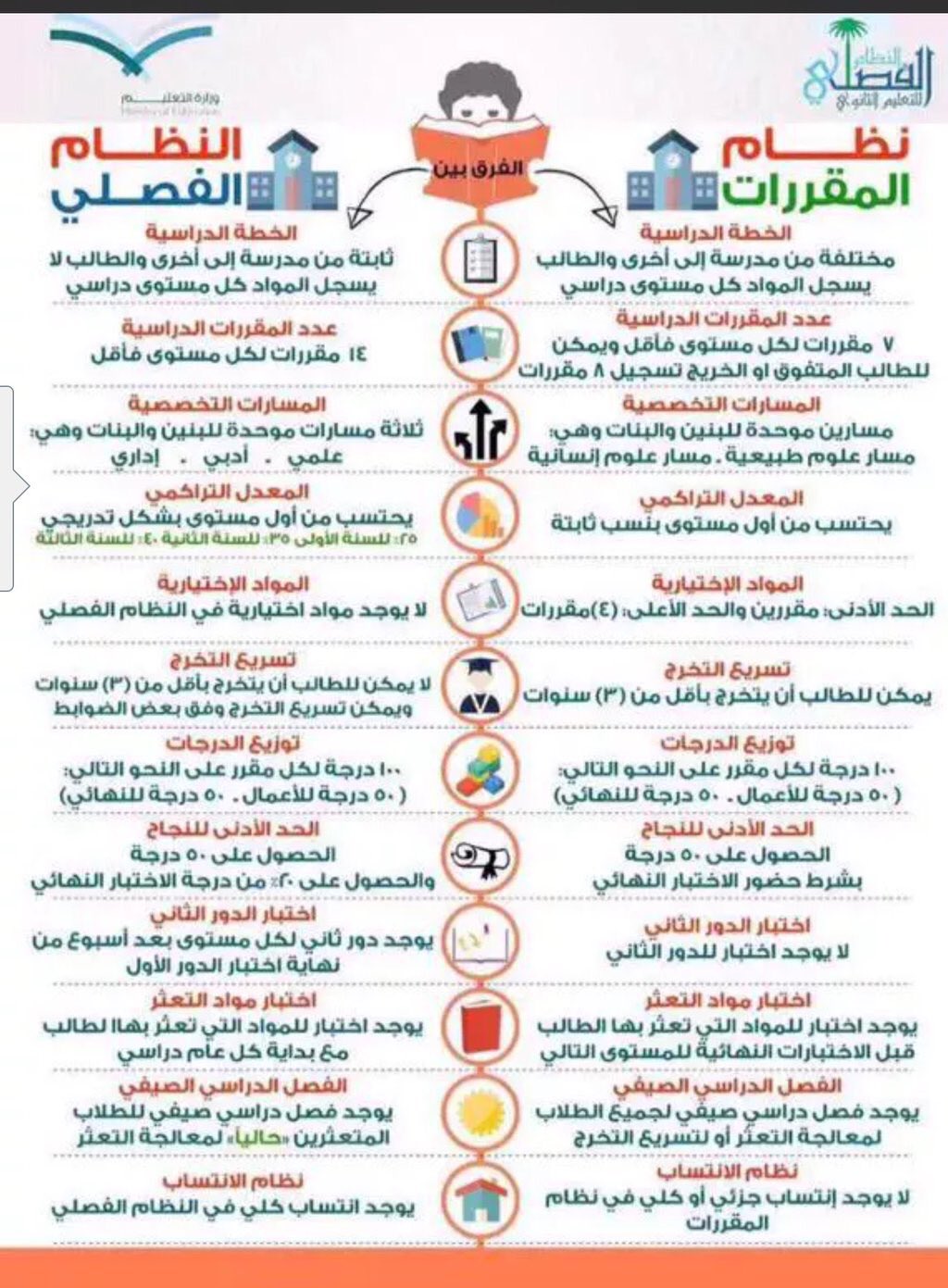 بعد عزم وزارة التعليم تطبيق نظام المقررات في جميع المدارس الثانوية بشكل مرحلي خلال 3 سنوات بدء ا بالفصل الأول الثانوي في العام الدراسي القادم 1440 1439هـ وبذلك سيلغى النظام الفصلي تدريجي ا. تعليم كوم من قسم. لائحة المعادلات والانتقال بين النظام الفصلي للتعليم الثانوي ونظام المقررات. في مقالنا سنستعرض كافة التفاصيل حول النظام الفصلي ونظام المقررات وسنوضح للطلبة القراء المقبلين على المرحلة الثانوية الفرق بين النظامين حتى يتسنى للطالب اختيار ما يناسبه من كلا.