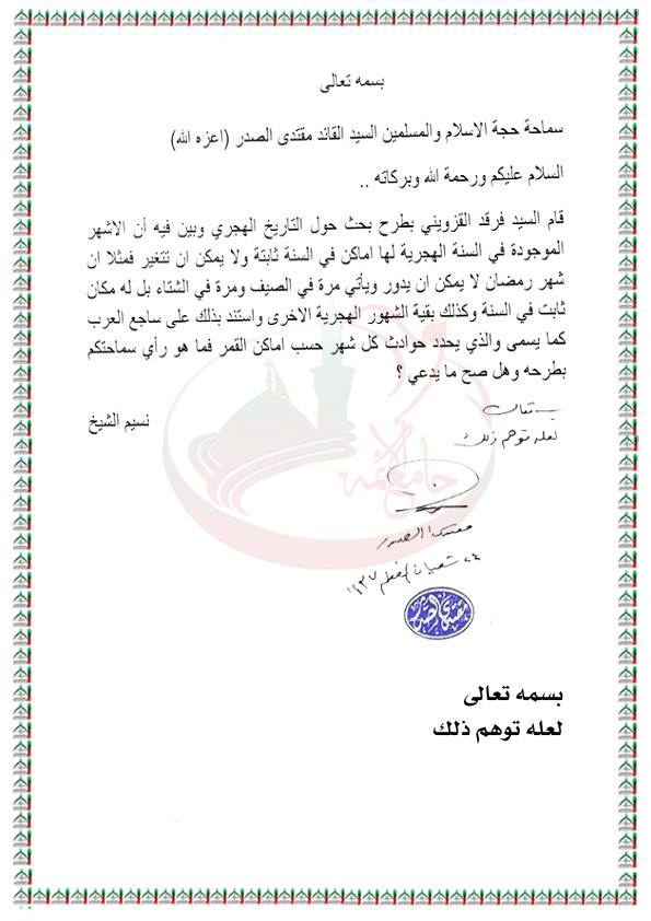 طرح يفيد بأن الاشهر الهجرية لها مواقع ثابتة في السنة ولا تتغير بين الفصول استفتاء السيد القائد مقتدى الصدر اعزه الله 2 6 2016 منتدى جامع الائمة الثقافي
